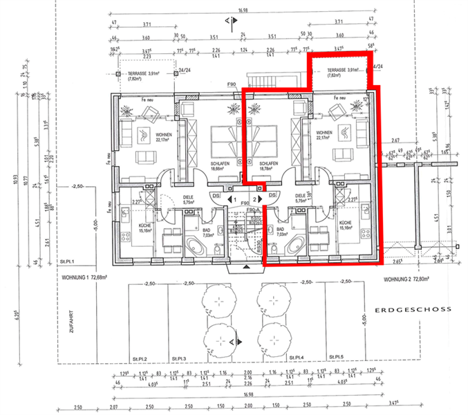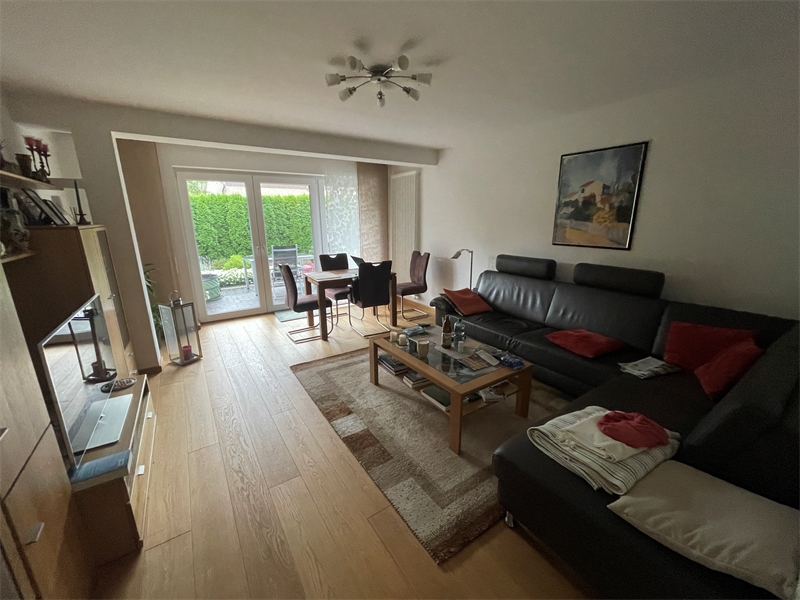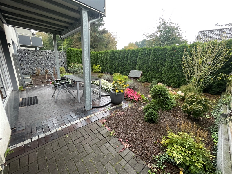 - Terrasse mit eigenem abgetrenntem Gartenanteil mit Rasenfläche